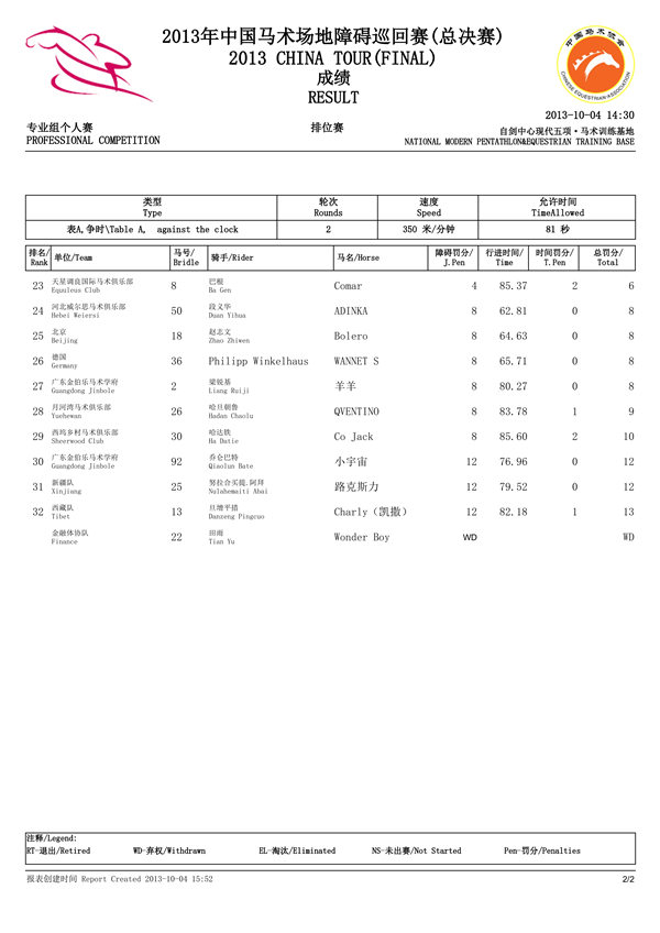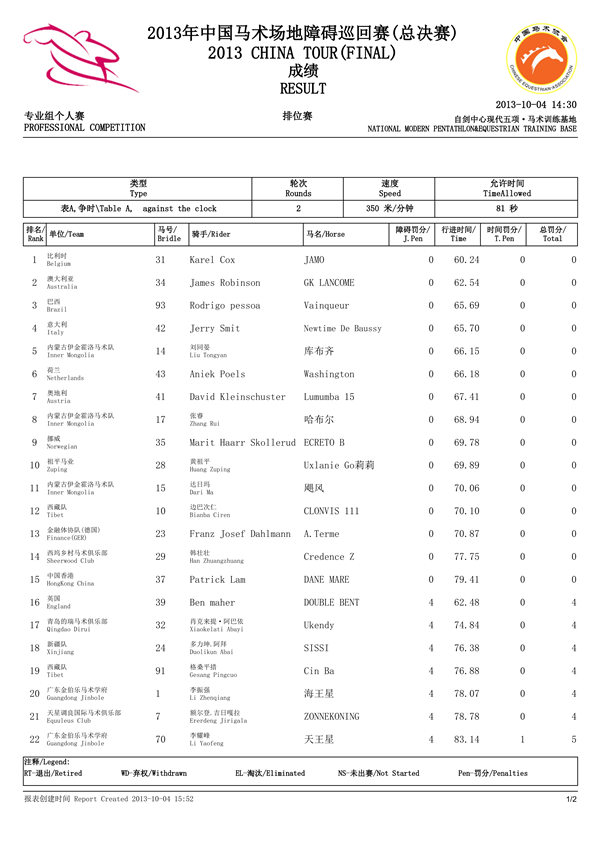 2013中国马术场地障碍巡回赛总决赛专业组个人赛排位赛成绩全部揭晓。比利时骑师Karel Cox位列第一。澳大利亚的James Robinson排名第二,巴西骑师Rodrigo pessoa排名第三。内蒙古刘同晏排名第五,是中国选手的最好成绩。