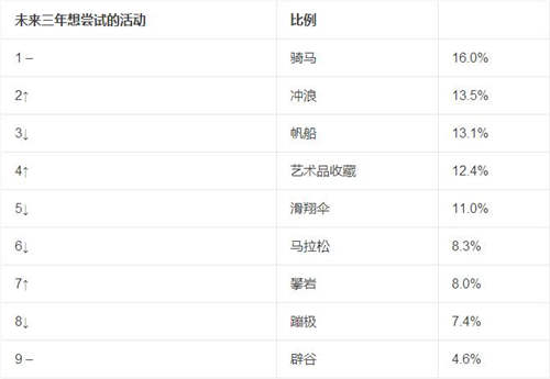 骑马成为中国高净值人群未来三年最想尝试的活动,其次是冲浪和帆船。