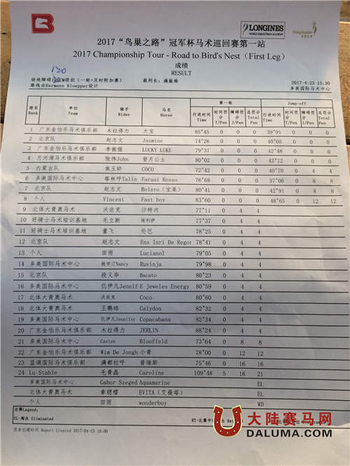 4月23日,2017“鸟巢之路”冠军杯马术巡回赛第一站在多美马术国际中心举行。本站比赛的第三场是120CM级别的场地障碍赛。在比赛如火如荼的进行之后,广东金伯乐马术俱乐部的选手木拉得力策骑“大宝”以39秒91的成绩斩获120cm级别场地障碍赛的冠军奖杯。北京队的赵志文策骑“Jasmine”以40秒05的成绩摘得亚军。季军则由同样来自广东金伯乐马术俱乐部的李振强策骑“LUCKY LUKE”以42秒48的成绩收归囊中。