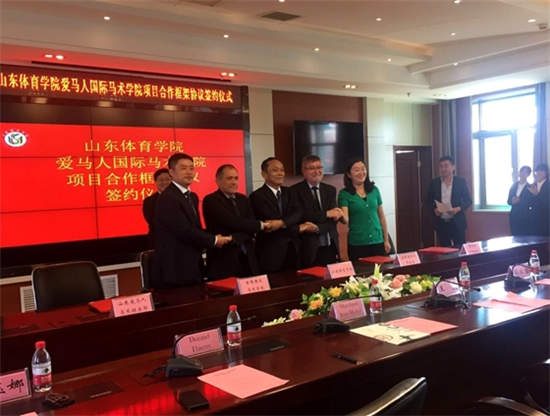 今天上午,山东体育学院与法国国家马术学院、法国索米尔市政府、山东爱马人马术俱乐部和蓬莱市人民政府等五方举行山东体育学院爱马人国际马术学院签约仪式,这是学校积极对接国家“一带一路”战略,培养具有国际视野的高素质、复合型人才的重要举措。