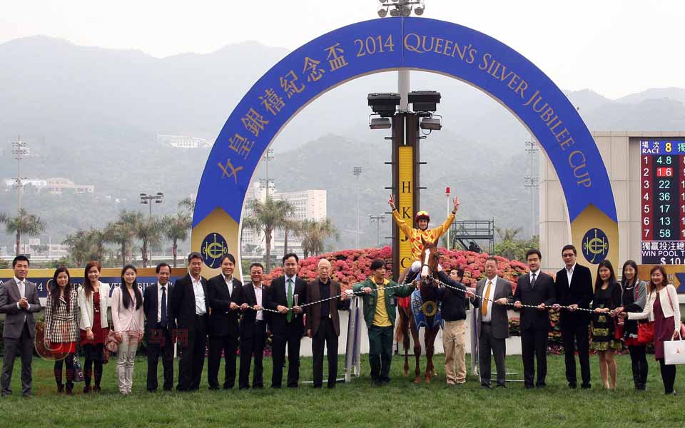香港赛马会主席施文信先生、一众马会董事、行政总裁应家柏及“大运财”的“大运财”的马主潘苏通、练马师高伯新及骑师韦达,于女皇银禧纪念杯颁奖礼上合影