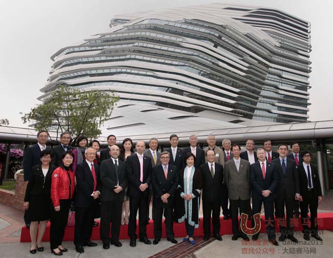 香港赛马会主席施文信先生(中)与教育局局长吴克俭先生、建筑师Zaha Hadid女爵士、理大校董会主席杨敏德女士(、校长唐伟章教授、前校董会主席罗仲荣博士、大学顾问委员会主席钟志平教授、大学教育资助委员会副秘书长任雅玲女士、理大设计学院院长方启思教授(等嘉宾为赛马会创新楼主持开幕典礼。