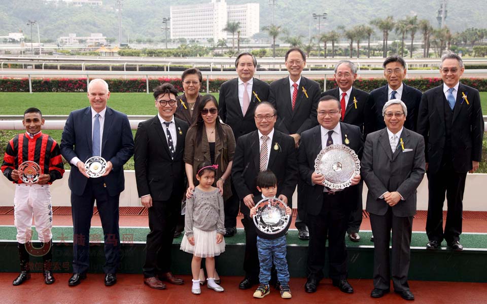 香港赛马会一众董事与“格哥儿”的马主萧剑平、练马师贺贤,以及骑师田泰安在精英碟颁奖仪式上合照。