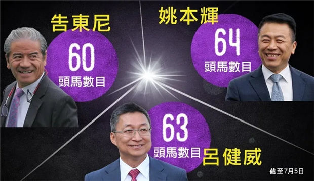 而愈演愈烈的冠军练马师之争先由吕健威于头场报捷登上榜首,告东尼亦不甘示弱于第2场凭“好运宝宝”还击,满以为吕健威能攀登榜首之际,姚本辉于尾场借“英之星”扳回一仗,三位各自胜出一场头马后,姚廄继续以一场之差力压对手。
