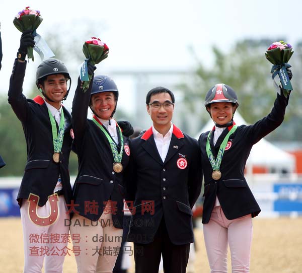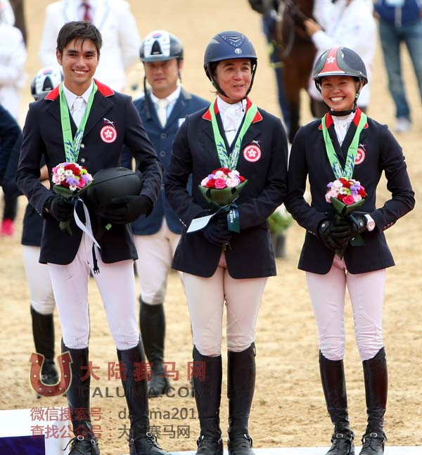 由香港骑手吴蓓华 (中)、何苑欣 (右) 及何诞华 (左) 组成的香港三项赛队在韩国仁川亚运会勇夺团体赛铜牌,为表扬他们为香港赢得首面的亚运会三项赛奖牌,各队员分别获马会颁发三万港元优异表现奖励金。