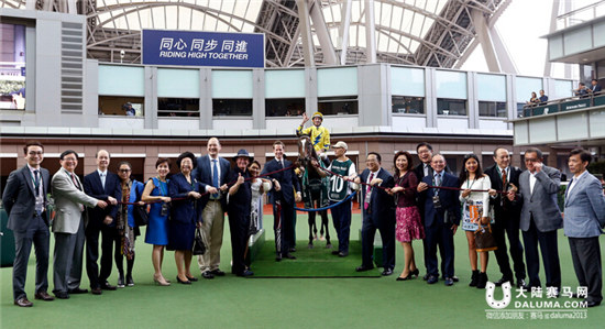 “明月千里”的马主及亲友、练马师约翰摩亚及骑师布文于赛后祝捷。