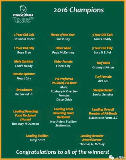 在今年美国宾夕法尼亚州育马者协会(Pennsylvania Horse Breeders Association, PHBA)举办的第三十八届年度易洛魁颁奖典礼晚宴(the 38th Annual Iroquois Awards Banquet)上,“完美城邦”(Finest City)被表彰为“宾州年度马王”,同时还获得另外两个奖项:“最佳成年雌马”(Older Female)和“年度最佳雌马”(Female Sprinter)。