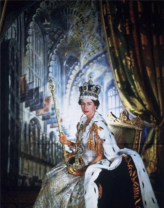 在这张加冕定妆照里,女王手里紧握权杖和宝球,头顶坎特伯雷大主教亲自为她戴上的重达近5斤,由纯金打造,镶有珠宝和钻石的圣爱德华王冠(1661年查理二世加冕时所打造)。不管是沉重的王冠还是冗长的加冕仪式,在多年之后,都被女王狠狠吐槽过一番:“不能低头,王冠会掉,脖子会断。”