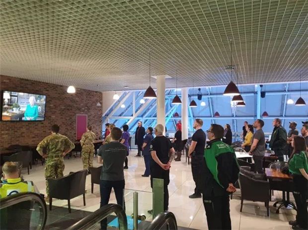 图:在伦敦新建好的南丁格尔“方舱”医院,工作人员们安静认真地观看女王的演讲。