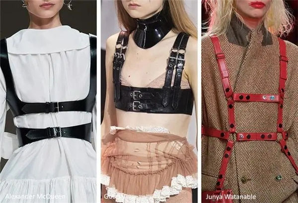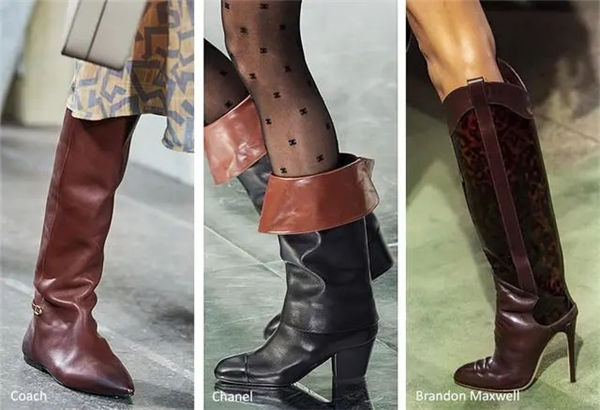香奈儿的所有模特都穿着同样的靴子,这双靴子是根据上世纪80年代初卡尔·拉格菲尔德(Karl Lagerfeld)的一双靴子设计的。这种骑马风格的靴子是用黑色皮革制成的,鞋轴的上部折叠起来,露出里面的棕色皮革。在布兰登麦克斯韦尔(Brandon Maxwell),骑马风格的靴子搭配短裙或紧身牛仔裤,看起来休闲而别致。这双及膝长靴呈v形,有紫红色、棕色或海军蓝皮革。渡边淳淳(Junya Watanabe)的系列以红色或黑色漆皮的系带皮制马具为特色,这种马术时尚可以搭配经典的男装风格的羊毛外套,给更为朴素的外套增添了性感感。在古驰(Gucci),由黑色皮革制成的粗直条纹马具与银色细部装饰,与清教风格或重荷叶边连衣裙形成了最鲜明的对比。