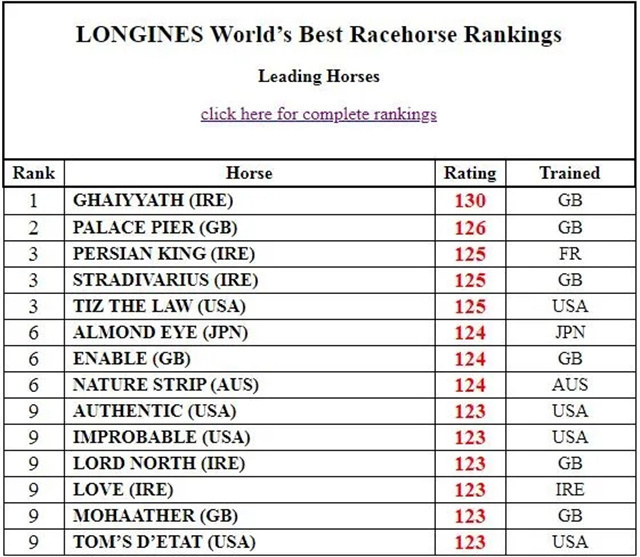 国际赛马联盟公布了最新一份全球赛马国际评分。截至9月6日,评分大洗牌,第一名仍然是“既成事实”(Ghaiyyath)以130分领先。第二位变成了杰克莫华大赛冠军“海上宫殿”(Palace Pier)评为126分。“柏斯国君”(Persian King)与“铁法如山”(Tiz the Law)以及评分维持不变的“弦乐器”(Stradivarius)同分。“成全宝”(Enable)赢出英皇锦标的评分为124分。至于香港赛马方面,因为评审期无大赛事,仍然是由“美丽传承”(Beauty Generation)评为122分。