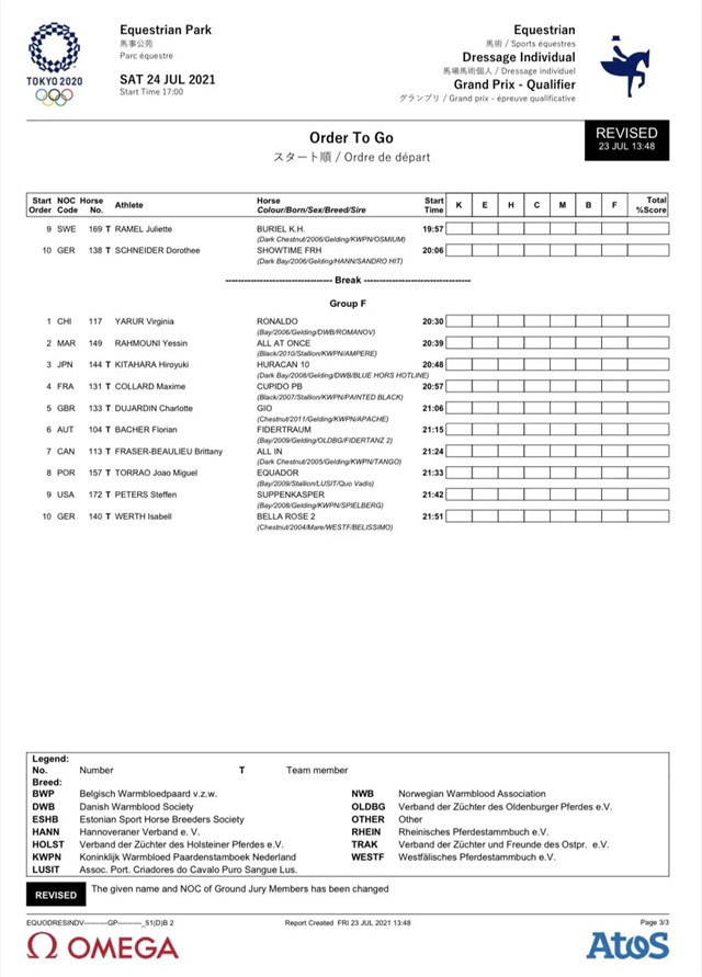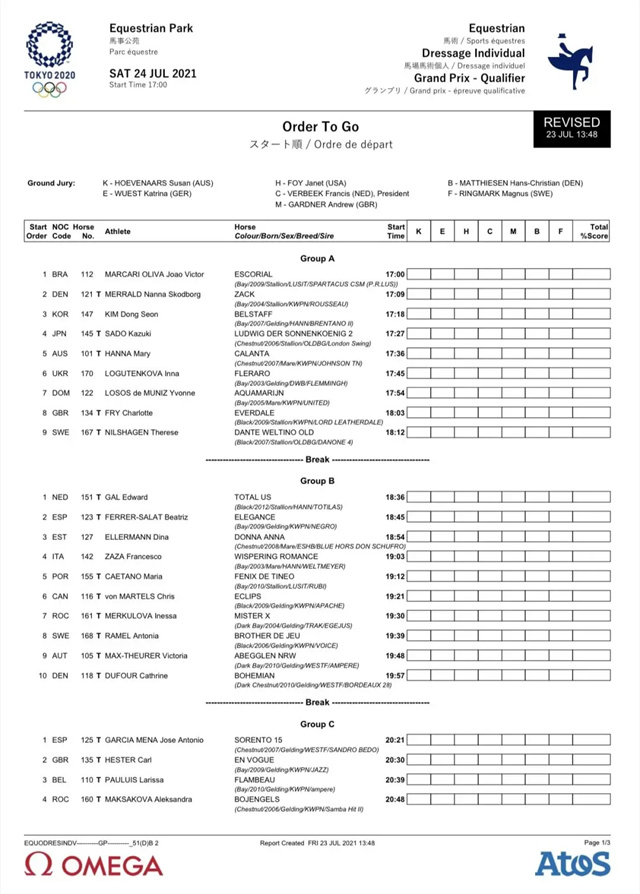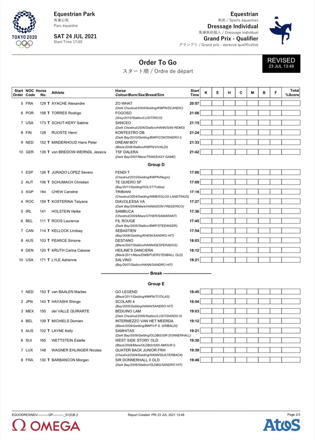 根据奥运会马术项目规定和赛程安排,北京时间7月24日和7月25日下午16:00,将进行为期2天的盛装舞步大奖赛的比赛。所有参赛国骑手和马匹将完成规定的动作,根据指派的三名骑手的成绩总和,决胜出排名,团体成绩排名前8的骑手和马匹将进入到团体盛装舞步特别大奖赛。