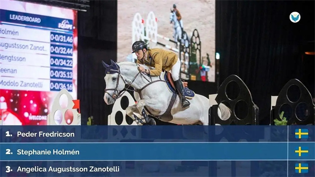 瑞典当地时间11月25日,世界排名第一、主场作战的瑞典骑手佩德·弗雷德里克森(Peder Fredricson)搭档H&M Cruisader Ice在斯德哥尔摩举行的瑞典国际马展(Sweden International Horse Show)一场总奖金为6.4万美元的四星级1.40米两段赛中拔得头筹。