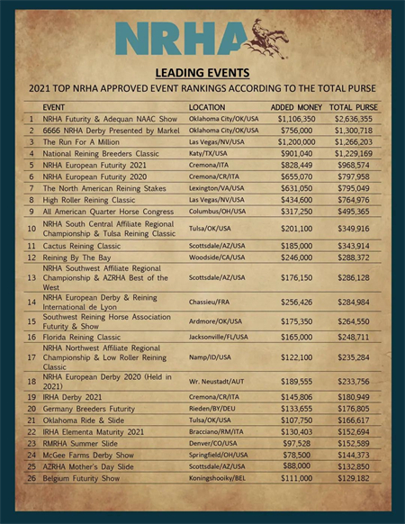 近日,NRHA(美国Reining马协会)National Reining Horse Association公布了2021年度全球50大协会认证的Reining赛事,根据总支出奖金进行排名。