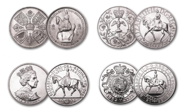 由伦敦哈顿斯发行的伊丽莎白二世女王“马术肖像”皇冠套装,由四枚硬币组成,分别标志着她 1953 年的加冕礼、1977 年的银禧年、2002 年的金禧年和 2022 年的铂金禧年。