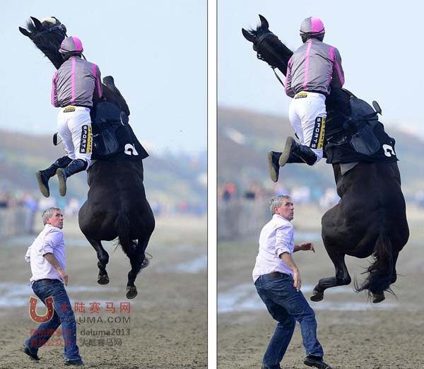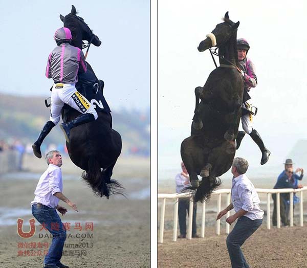 9月4日,在爱尔兰米斯郡莱顿(Laytown)举行的赛马比赛上,一匹马突然人立而起,身在一旁的马夫险些与赛马相撞,骑手竭力安抚,幸而无人受伤。