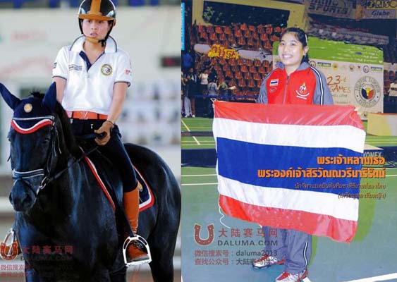 根据泰国马术协会发布的2014年韩国仁川亚运会参赛名单显示,泰国公主诗丽婉娜将参加场地障碍项目的马术比赛。公主的特殊身份也将为亚运会马术比赛场增添一份别样的风景。要知道,这位美女在八年前的亚运会上还是代表泰国羽毛球队打比赛呢!