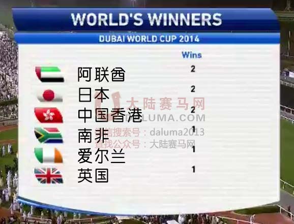 2014迪拜赛马世界杯获胜头马所属代表队分布: