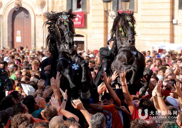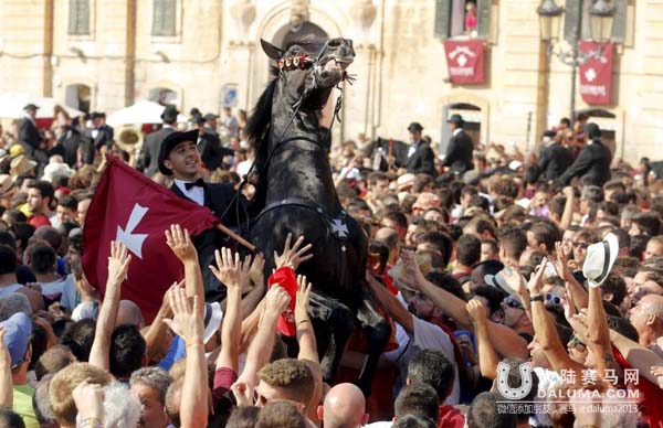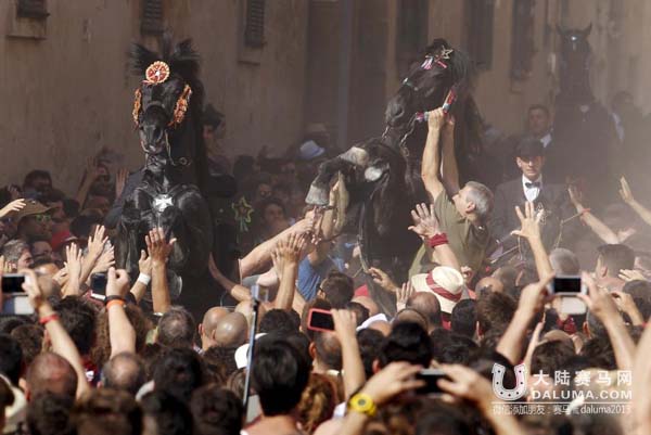 当地时间2015年6月23日,西班牙梅诺卡地区巴利阿里岛的西乌达德拉镇,当地民众庆祝传统节日“圣约翰节”。街头上演精彩马术表演,按照当地习俗,民众纷纷触及马的前胸,以求获得好运。