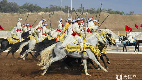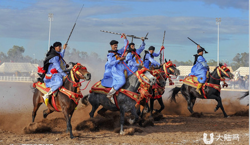 当地时间2015年10月18日,摩洛哥Al Jadida,第8届Al Jadida马术节上,摩洛哥人骑在马上表演传统标枪运动“tebburide”。tebburide是摩洛哥人在15世纪庆祝战胜西班牙的庆祝形式之一。
