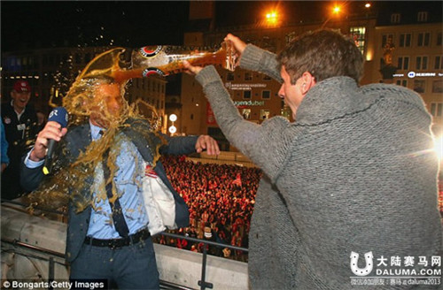 穆勒(右,正往主持人身上倒啤酒)是有名的爱开玩笑,这大概也就能解释马奇怪的名字了。