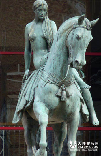 不过,这些也不妨碍我们考虑一点现实的问题,比如,戈黛娃夫人到底是如何骑马的?在更现代一些的绘画中(比如标题图、商标和John Collier的那副画),她都是跨坐在马背上。而考文垂市的塑像,和下面这幅十六世纪的油画中,她则采取“侧骑式”,双腿位于马身的同一侧。虽然跨骑在现代人看来更潇洒美观,但“侧骑”才是一个10世纪贵妇可能采取的骑马方式,欧洲贵族女性在漫长的岁月间(一直到20世纪初)期都以这种姿态骑马,比如英剧《唐顿庄园》第一季中的大小姐玛丽。