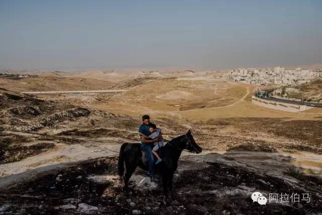 39岁的Mohammad al-Eisawi和他5岁的儿子Majd骑着他们的阿拉伯马在Issawiya贫民窟附近的山上。