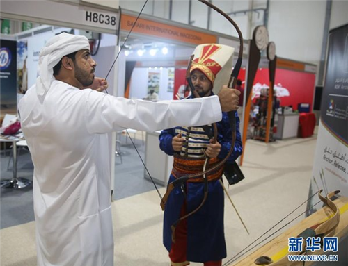 第十四届阿布扎比国际狩猎与马术展上,一位阿联酋人在试拉一款狩猎专用弓。