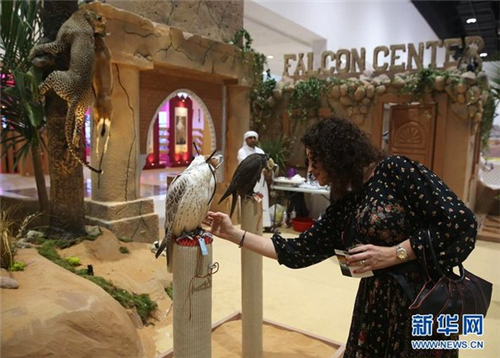 第十四届阿布扎比国际狩猎与马术展上,一位阿联酋人在调驯一只猎鹰。