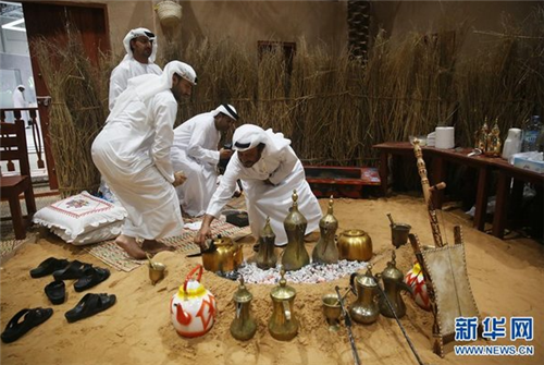 第十四届阿布扎比国际狩猎与马术展上,传统阿拉伯咖啡烹制。