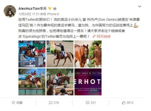 而奥运骑士华天的战马“堂·热内卢”也被提名啦!他可是里约奥运会参赛马匹中最年轻的马匹之一。