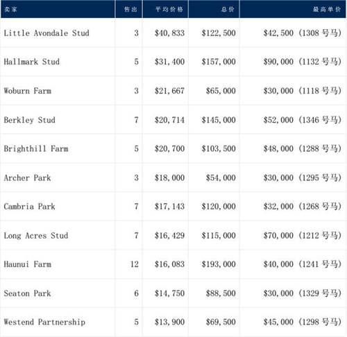 本次最大的卖家Haunui Farm共售出12匹马,总价19.3万。其中价格最高的是1241号马,以4万新西兰币的价格售出,被香港的Tartan Meadow Bloodstock购入。