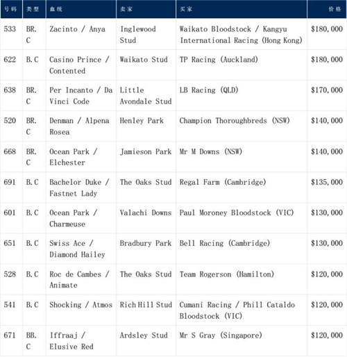 Inglewood Stud的小公马533号马是出自他们自己的种公马Zacinto,他创造了当天的最高价18万新西兰币。Bryce Tankard的Waikato Bloodstock和Kangyu International Racing联合买下了这匹马。Zacinto之前的子嗣已经出现在赛场上,第一季的子嗣中已经出现了像Ugo Foscolo这样优秀的马匹,他在G1一级赛两千坚尼赛中获得了冠军。