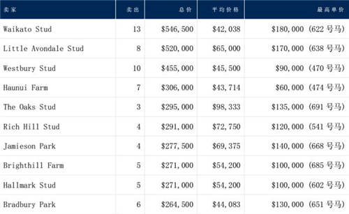 怀卡托牧场在优选马拍卖会上以微弱优势领先剑桥牧场(Cambridge Stud)。今天,他们又卖出了13匹马,在总价上再次排名第一位。而平均售出价达到98333的The Oaks Stud则在平均价格上排名第一位(售出3匹或以上)。