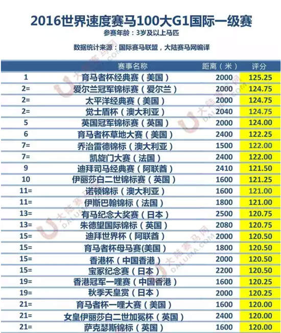 2016育马者杯经典赛以125.25的分数登顶国际赛马联盟评选的2016全球百大一级赛榜首宝座。