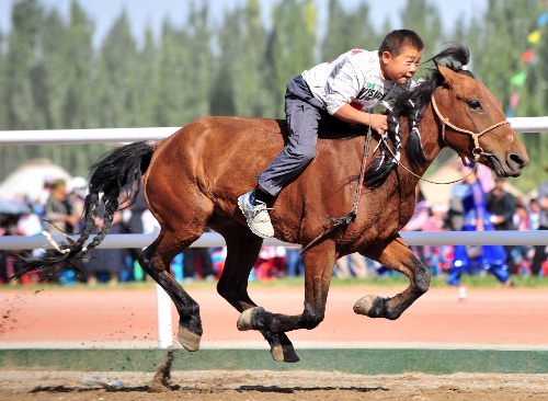 9月15日,一名小选手在甘肃阿克塞哈萨克族自治县赛马场骑行,赛马四蹄腾空疾驶。当日,阿克塞县举办了3000米速度赛马,参赛选手大多是十二三岁的小男孩。这些孩子身形敏捷,技艺高超。奔马都不备鞍具,骑手直接骑坐在马背上,驾驭马匹快速奔跑。