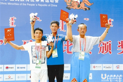 8月10日展开的民族传统体育运动会上,通辽市可谓满载而归。 通辽市代表队骑手希仁巴图(图中)为内蒙古代表团夺得了一等奖(冠军),这也是通辽市选手夺取的第一个冠军。此外,通辽市代表队骑手董春宏(图左)获得二等奖(亚军),呼努斯吐(图右)获得三等奖(季军)。今年54岁的希仁巴图先后参加过六届全国民运会,五次夺得冠军,真所谓马场上无老少。