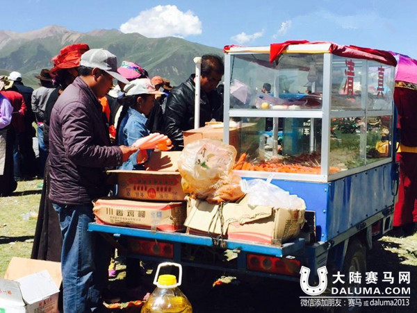 一位烧烤摊主边烤烤肠边高兴地说:“赛马节好啊,每年都会带着一些小东西出来,一方面可以观看玉树赛马节,另一方面,也可以增加一些收入,如果好的话一天能上千呢!”