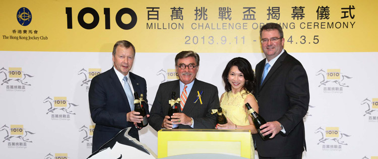 新一届《1O1O百万挑战杯》于昨晚正式揭香港赛马会主席施文信及行政总裁应家柏(左二及一),与赞助商代表齐齐主持开幕仪式。
