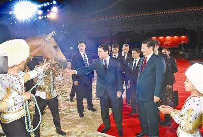 5月12日晚,土库曼斯坦总统别尔德穆哈梅多夫代表土方赠予国家主席习近平一匹汗血马。这也是中土建交以来,土方第三次将汗血马作为国礼赠送给中方。