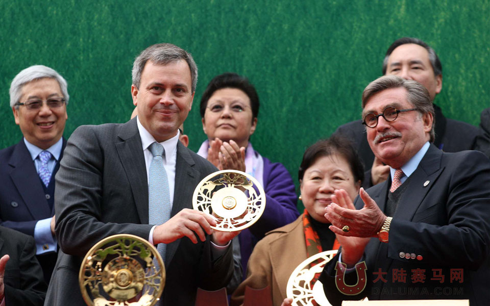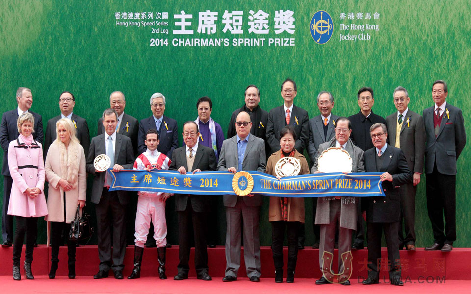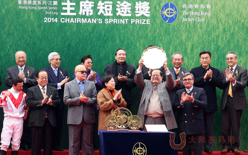 香港赛马会主席施文信与其他董事及行政总裁应家柏在主席短途奖颁奖仪式上,颁发主席短途奖的奖座及镀金碟予「天久」的马主张福滔医生及夫人、练马师方嘉柏及骑师柏宝。