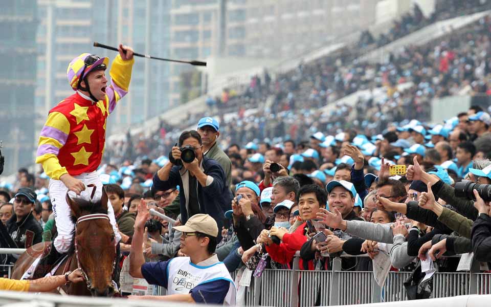 ·冠军骑师贝汤美于胜出宝马香港打吡大赛后向在场的马迷致意。