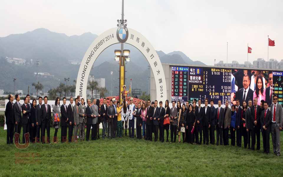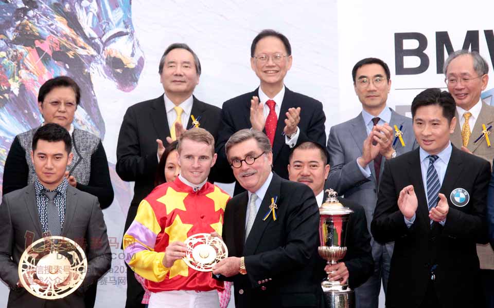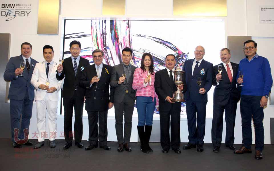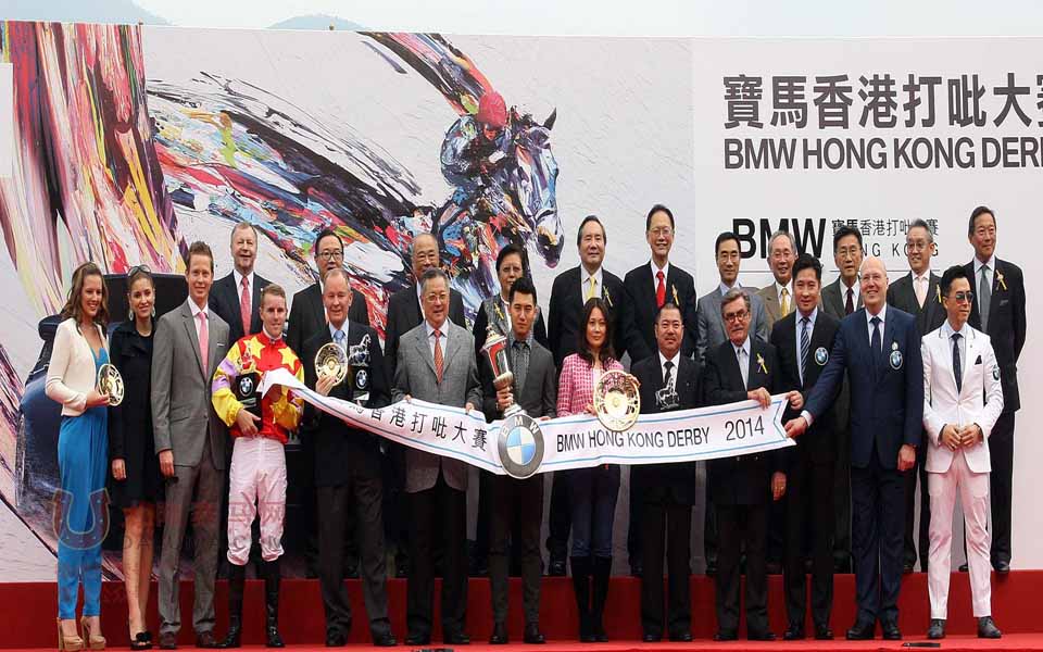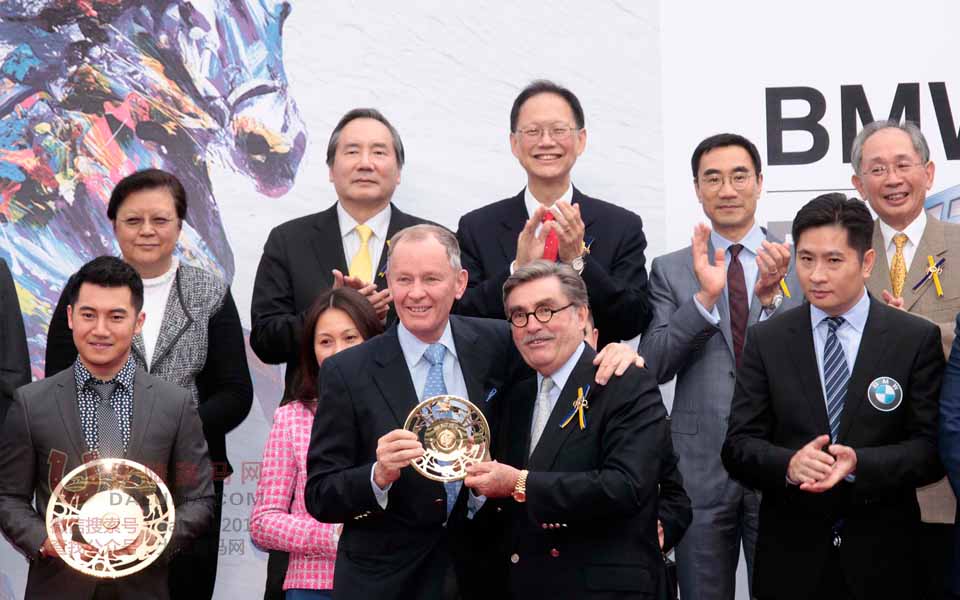 ·香港赛马会主席施文信先生、一众马会董事及行政总裁应家柏、宝马汽车(香港)有限公司香港及澳门董事总经理曾耀民先生、宝马集团进口业务香港、澳门及台湾副总裁孔楷文先生及宝马香港打吡大使甄子丹先生,与“威尔顿”的马主郑强辉先生、练马师约翰摩亚以及骑师贝汤美,在宝马香港打吡大赛颁奖仪式上合照。