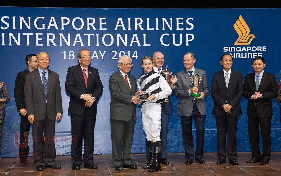 “花月春风”的马主包大伟、练马师约翰摩亚及骑师贝汤美于新航国际杯颁奖礼上获颁冠军奖杯及银碟。