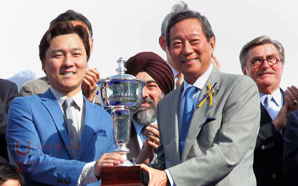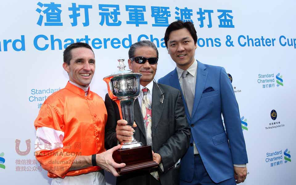 香港赛马会副主席叶锡安博士于赛后颁发渣打冠军暨遮打杯奖杯及镀金碟予头马“将男”的马主奔腾赛马团体代表、练马师告东尼及骑师郭能。