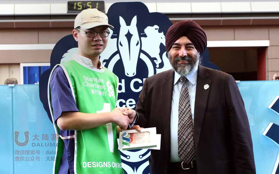 渣打集团执行董事兼亚洲区行政总裁白承睿颁发最佳外观马匹奖予负责料理“威尔顿”的马房助理。