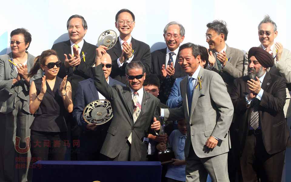 渣打冠军暨遮打杯头马“将男”的马主、练马师及骑师合照。