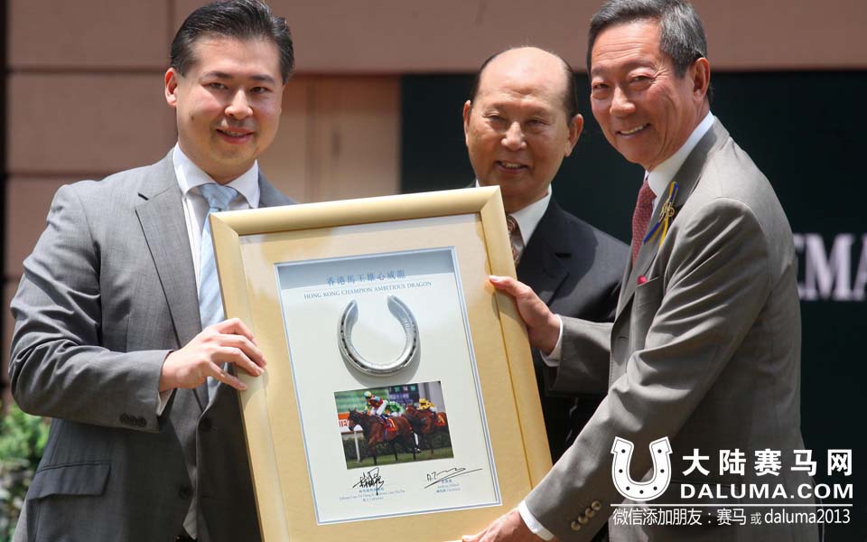香港赛马会主席叶锡安博士(右)致送“雄心威龙”的珍藏纪念相予马主林培雄(中) 及林显裕 (左)。