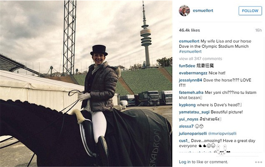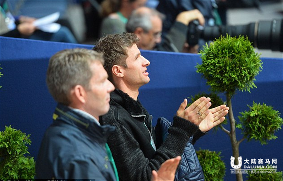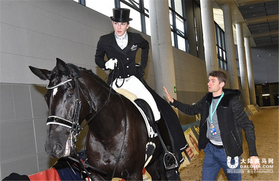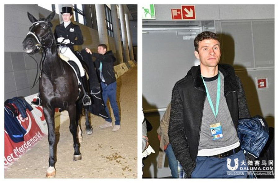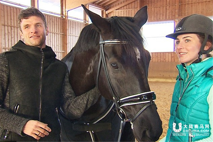 近日,拜仁球星穆勒陪同妻子丽莎,出席了在慕尼黑举办的室内马术比赛。穆勒是有名的爱马人,图中的马是两人所养的戴夫。不过出于对于球员身体的保护,拜仁俱乐部禁止穆勒亲自喂食戴夫。