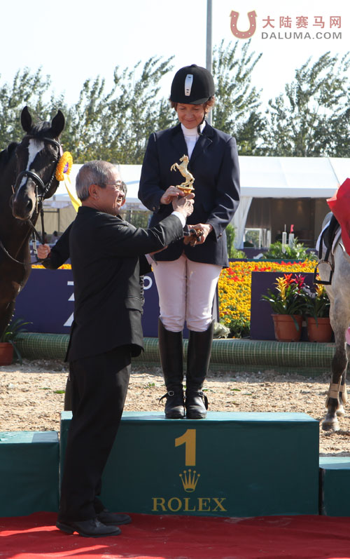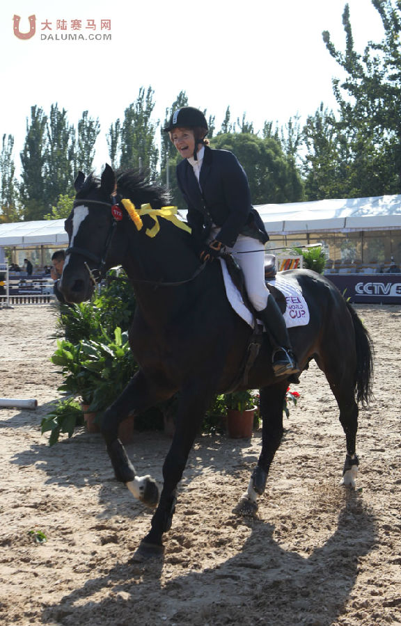 10月20日上午,2013国际马联FEI场地障碍世界杯中国联赛总决赛90-100cm青少年及马主赛第二轮9:00准时打响。比赛当天主办地朝阳公园的天气非常好,应该是开赛以来最好的一天。第十八位出场的来自北京天星调良国际马术俱乐部的夏莉和马匹VAMIRO发挥出色,再次取得0罚分,行进时间71.22秒。由于首轮夏莉也是0罚分,她的成绩已经确保她可以稳进马主赛前三,最后两轮成绩相加,夏莉和VAMIRO获得马主赛冠军!